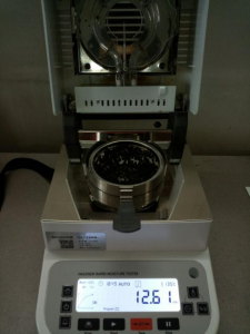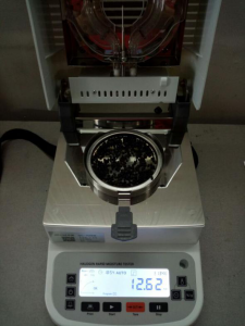 - 測(cè)試種子顆粒1:為了使測(cè)試過程中種子水分儀將種子烘干烘透,我們將種子分散開來,以便溫度能滲透進(jìn)種子內(nèi)部。取5克種子顆粒撒于不銹鋼托盤中,用鑷子將種子顆粒平鋪均勻,為避免種子烘烤后變焦,我們將溫度設(shè)置在135℃,按“START”鍵開始測(cè)試,18分49秒后檢測(cè)結(jié)束,檢測(cè)數(shù)據(jù)顯示12.61%;